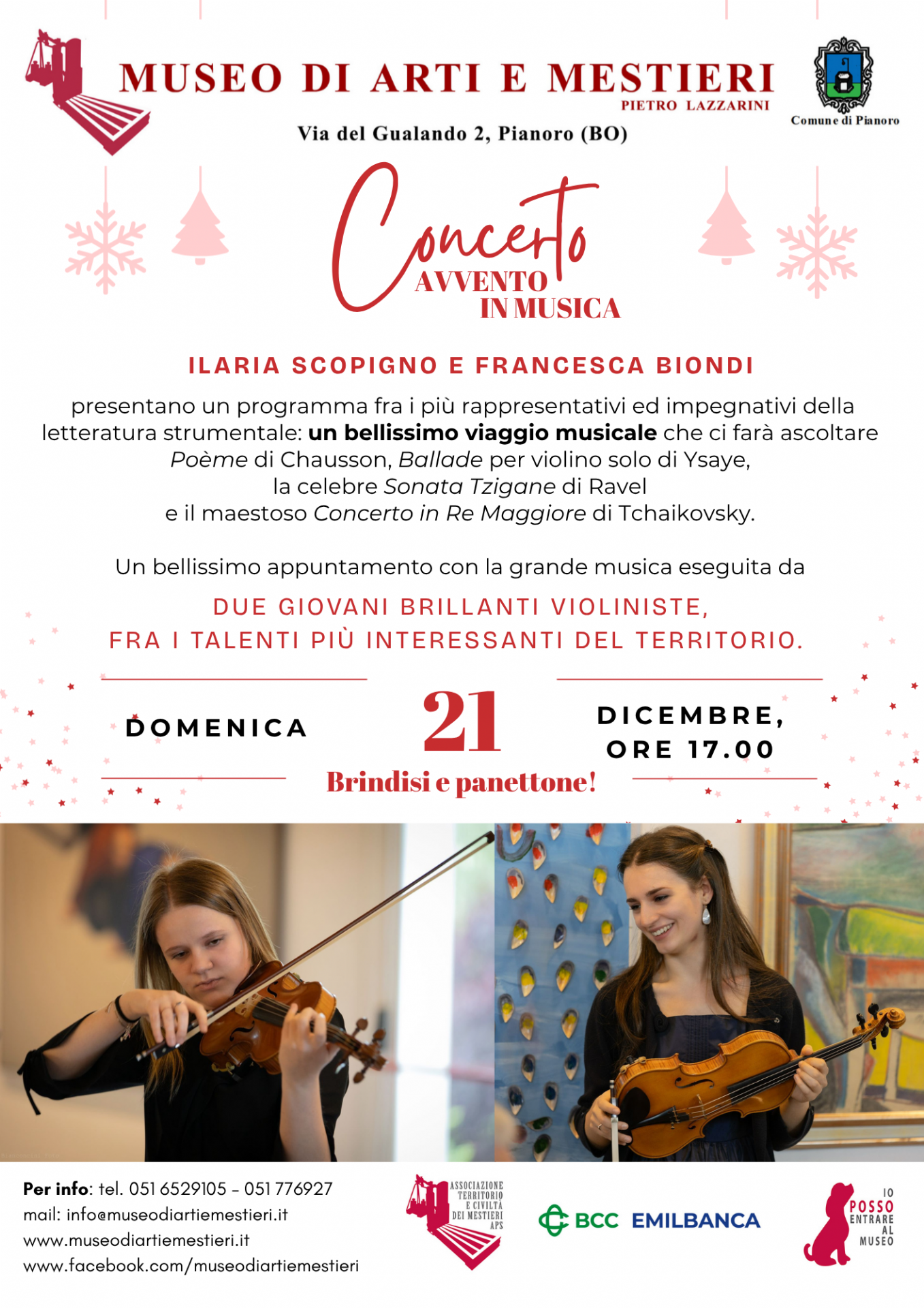 Un viaggio tra le grandi opere per violino; un bellissimo appuntamento con la grande musica classica, eseguita da due giovani brillanti violiniste, tra i talenti più interessanti del territorio: Ilaria Scopigno e Francesca Biondi che presentano un programma tra i più rappresentativi e impegnativi della letteratura strumentale: un bellissimo viaggio musicale che farà ascoltare: Poème di Chausson, Ballade per violino solo di Ysaye, La celebre Sonata Tzigane di Ravel, Il maestoso Concerto in Re Maggiore di Tchaikovsky