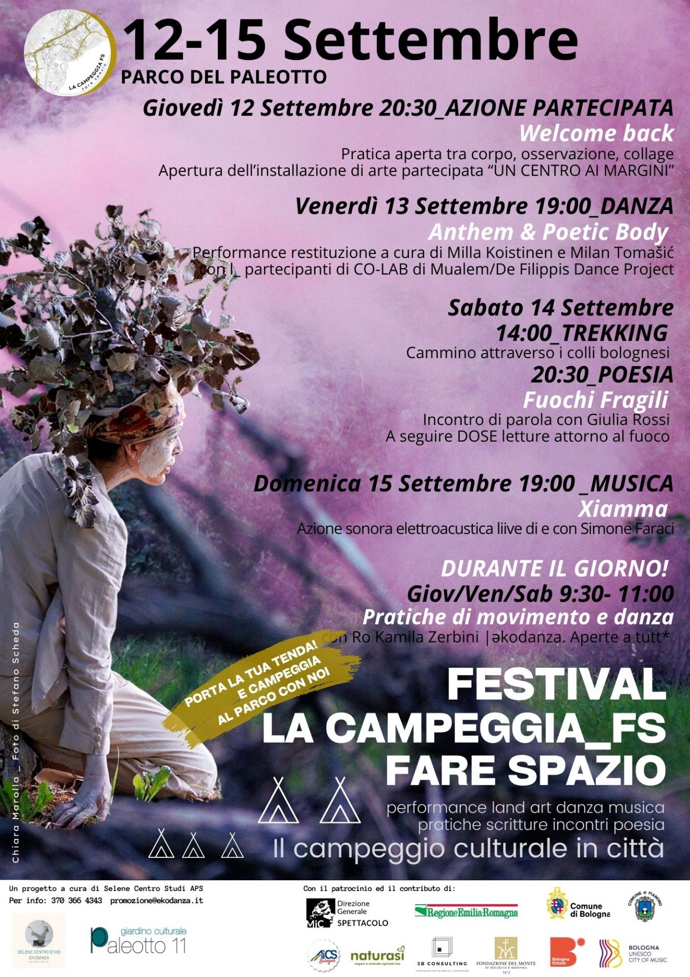 Dal 12 al 15 Settembre il centro culturale Paleotto11 apre le porte alla quarta e ultima Campeggia con una programmazione immersiva di residenze artistiche, concerti, incontri, installazioni e pratiche in cui l’esperienza è la parola chiave dell’esserci. La Campeggia FS, suggerisce la possibilità di mettere le tende nel giardino e risiedere per tutti i 4 giorni del festival respirando così un’atmosfera di vacanza. Siamo a 30 minuti dal centro città con i mezzi di trasporto pubblici.