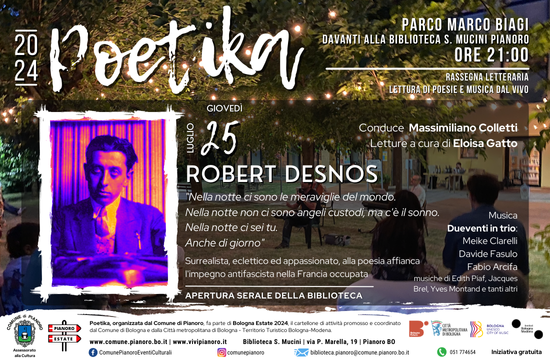 Poetika, organizzata dal Comune di Pianoro, fa parte di Bologna Estate 2024, il cartellone di attività promosso e coordinato dal Comune di Bologna e dalla Città metropolitana di Bologna - Territorio Turistico Bologna-Modena.