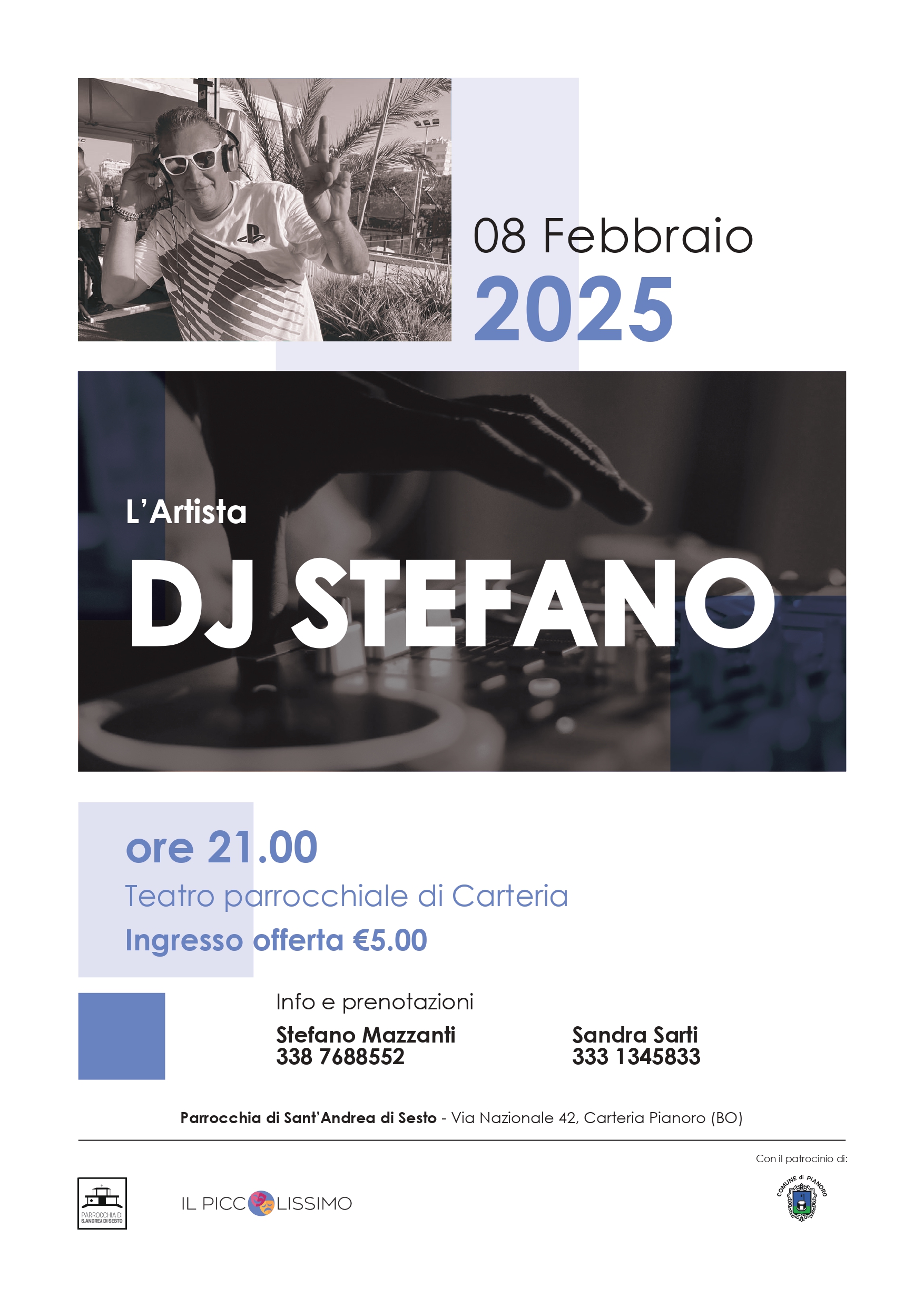 Sabato 8 febbraio 2025, dalle 21.00, presso il Teatro Parrocchiale di Carteria di Sesto, in via Nazionale 42, serata dj set con Dj Stefano