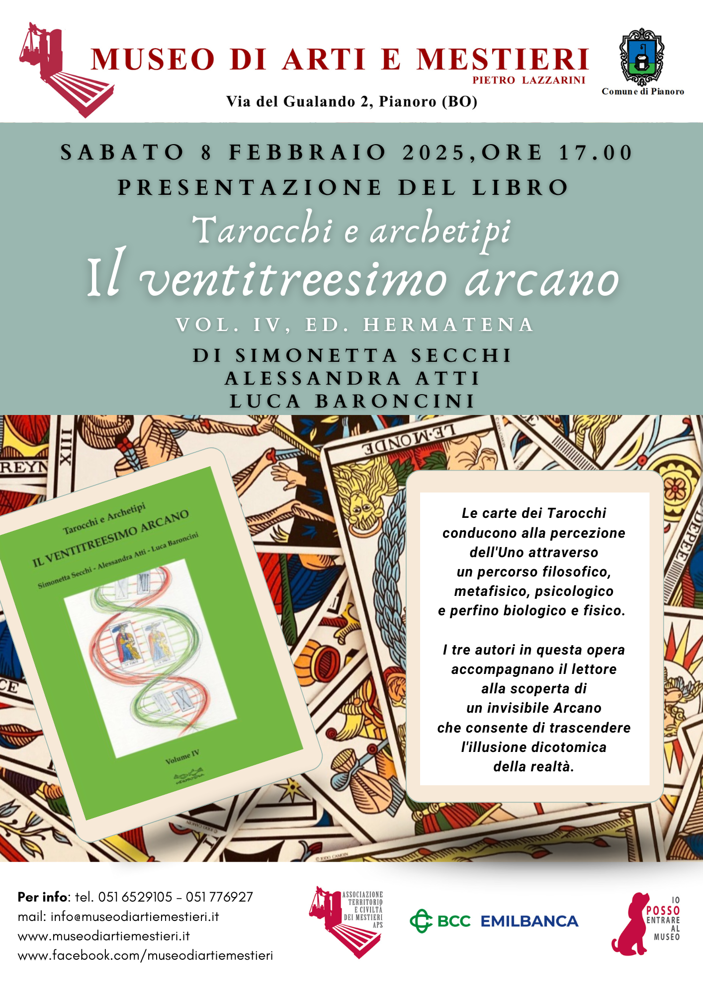 Sabato 8 febbraio 2025, ore 17,00, presso il Museo di Arti e Mestieri P. Lazzarini, via Gualando 2, Pianoro, presentazione del libro “Tarocchi e Archetipi - Il ventitreesimo Arcano” - Vol. IV, Ed. Hermatena