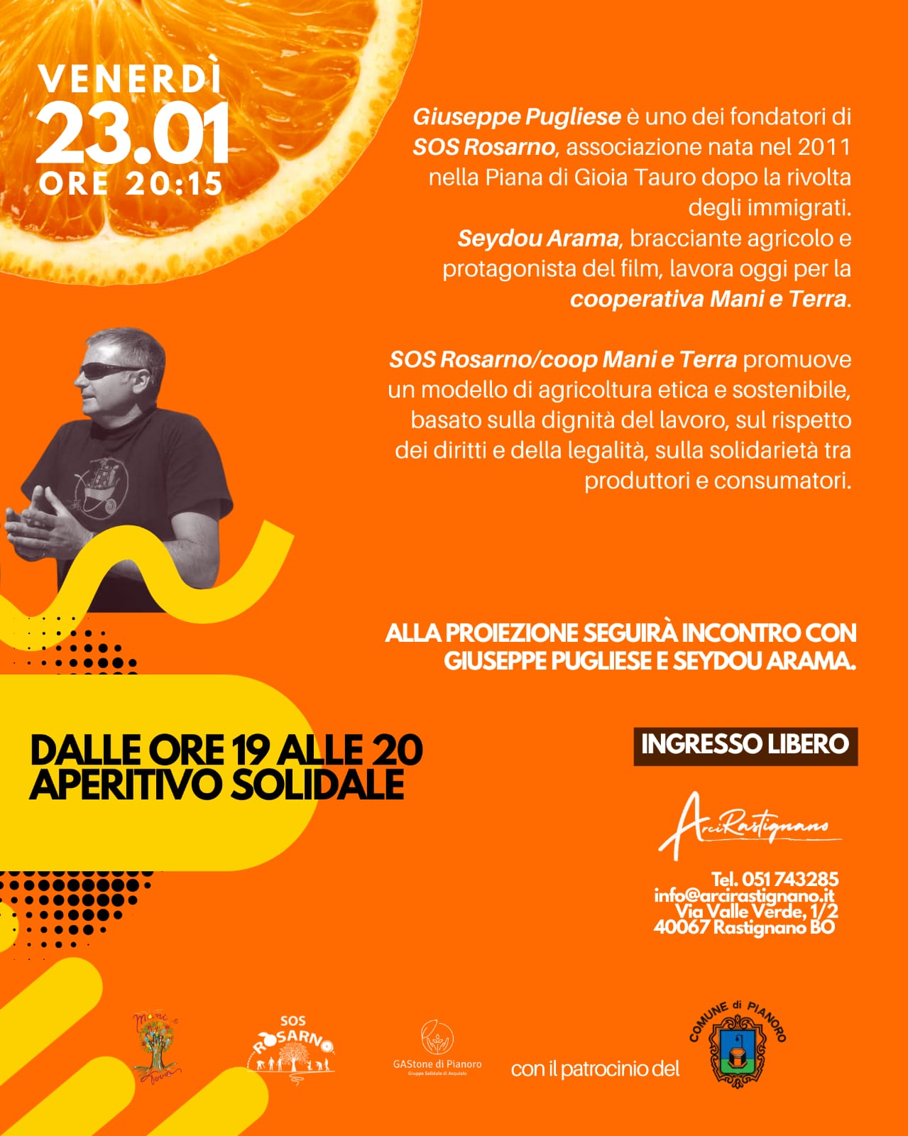 A seguire dibattito con Giuseppe Pugliese, fondatore di SOS Rosarno / Coop Mani e Terra, per parlare di agricoltura etica, legalità e solidarietà.
