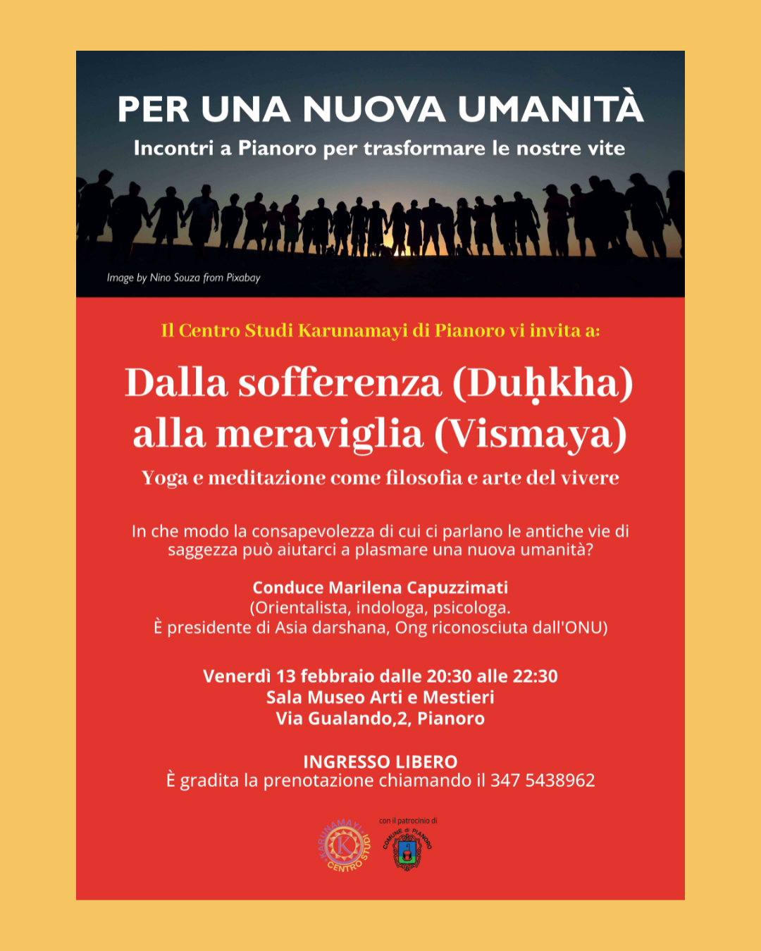La serata sarà condotta da Marilena Capuzzimati, orientalista, indologa e psicologa, presidente dell’associazione Asia Darshana, organizzazione non governativa riconosciuta dall’ONU. Attraverso il dialogo con le antiche tradizioni di saggezza orientale, l’incontro offrirà spunti di riflessione su come la consapevolezza possa aiutarci ad affrontare la sofferenza e a trasformare il nostro modo di vivere, contribuendo alla costruzione di una nuova umanità più attenta, solidale e presente.