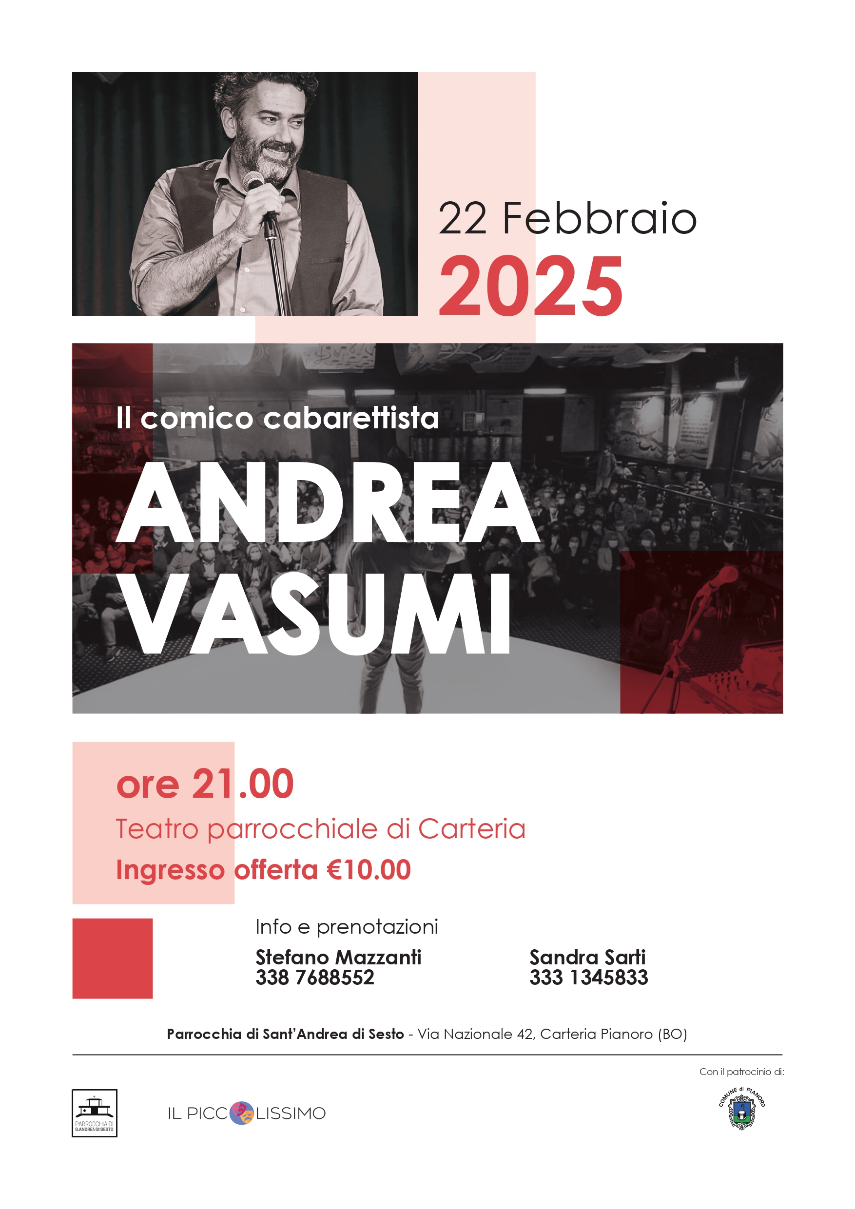 Sabato 22 febbraio 2025, dalle 21.00, presso il Teatro Parrocchiale di Carteria di Sesto, in via Nazionale 42, spettacolo teatrale del cabarettista e monologhista Andrea Vasumi