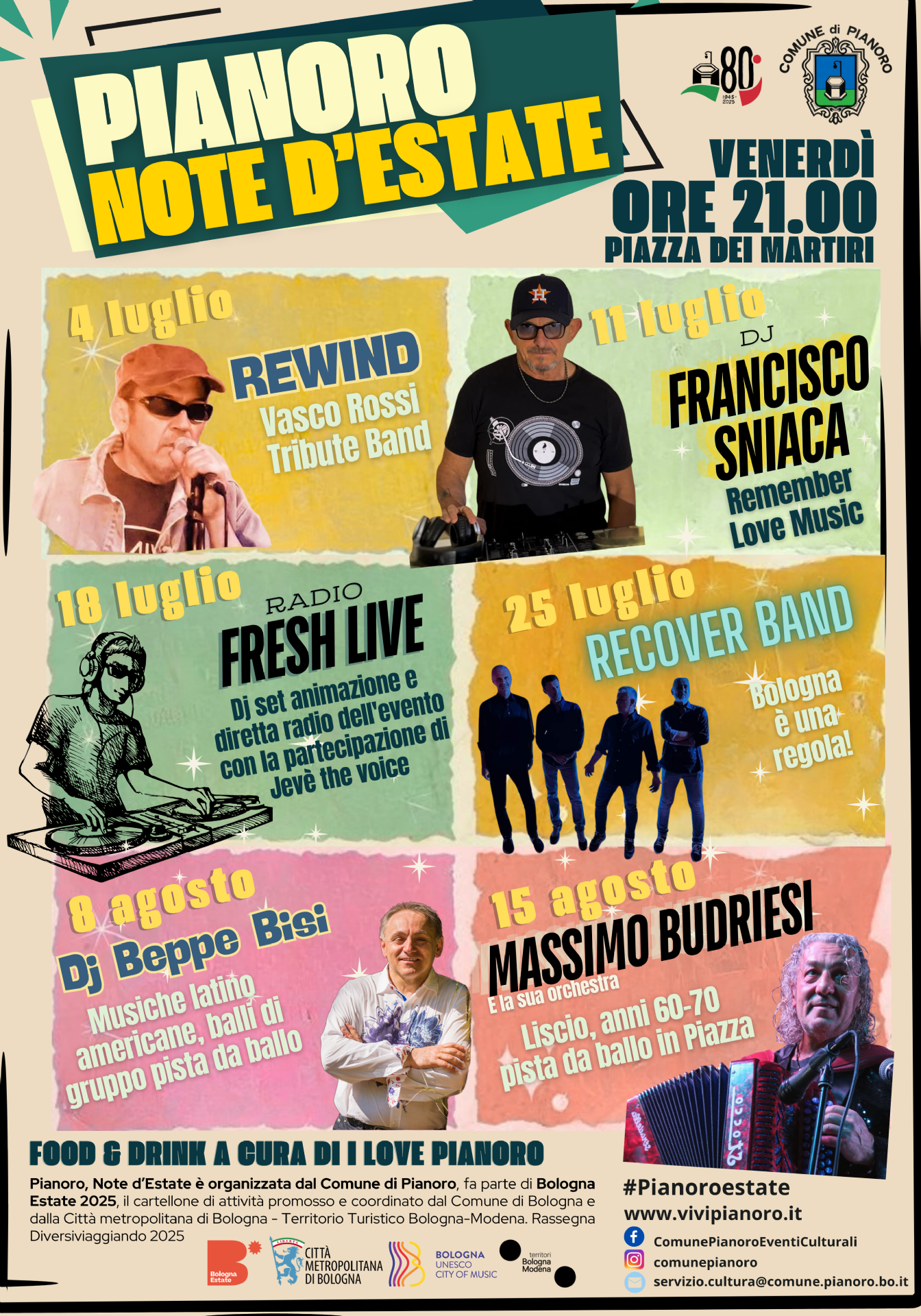 Gli eventi si terranno tutti i venerdì alle ore 21.00 in Piazza dei Martiri, trasformando il cuore di Pianoro in un palcoscenico vivace all'aperto.