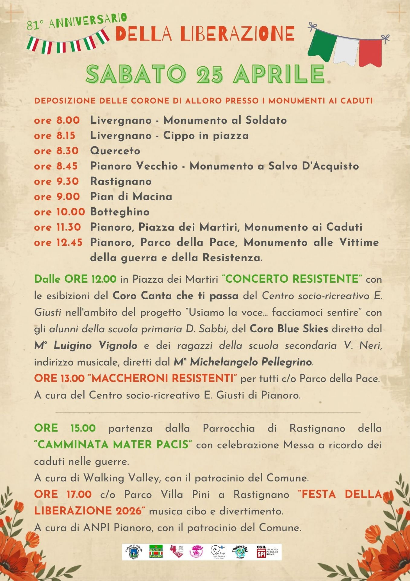 Dalle ore 12.00 | in Piazza dei Martiri “Concerto Resistente” con le esibizioni del Coro Canta che ti passa del Centro socio-ricreativo E. Giusti nell'ambito del progetto “Usiamo la voce... facciamoci sentire” con gli alunni della scuola primaria D. Sabbi, del Coro Blue Skies diretto dal M° Luigino Vignolo e dei ragazzi della scuola secondaria V. Neri, indirizzo musicale, diretti dal M° Michelangelo Pellegrino.