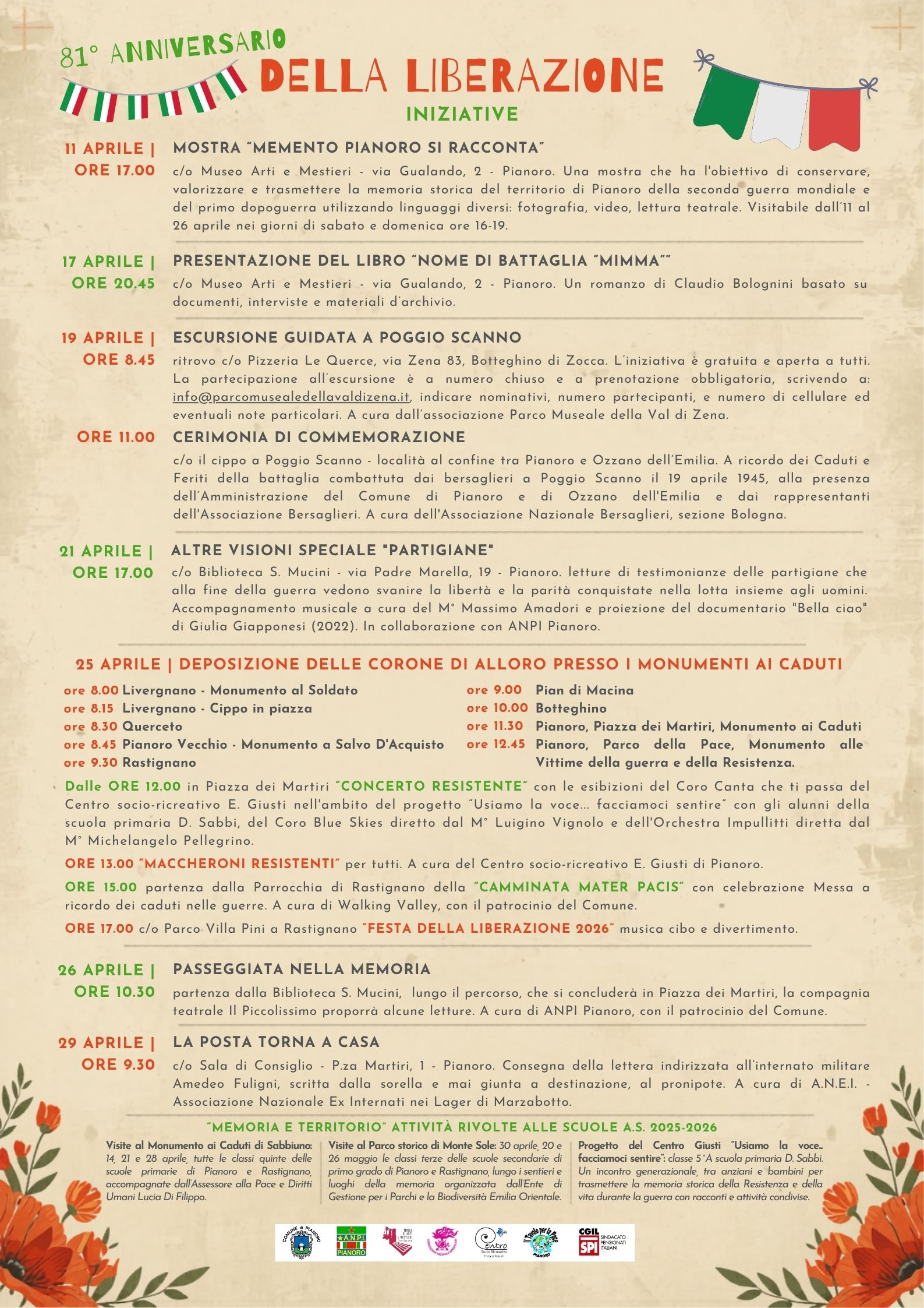 DOMENICA 26 APRILE | ore 10.30, parte dalla Biblioteca S. Mucini la 4^ edizione della “Passeggiata nella Memoria”. Lungo il percorso, che si concluderà in Piazza dei Martiri, la compagnia teatrale Il Piccolissimo proporrà alcune letture. A cura di ANPI Pianoro, con il patrocinio del Comune.
