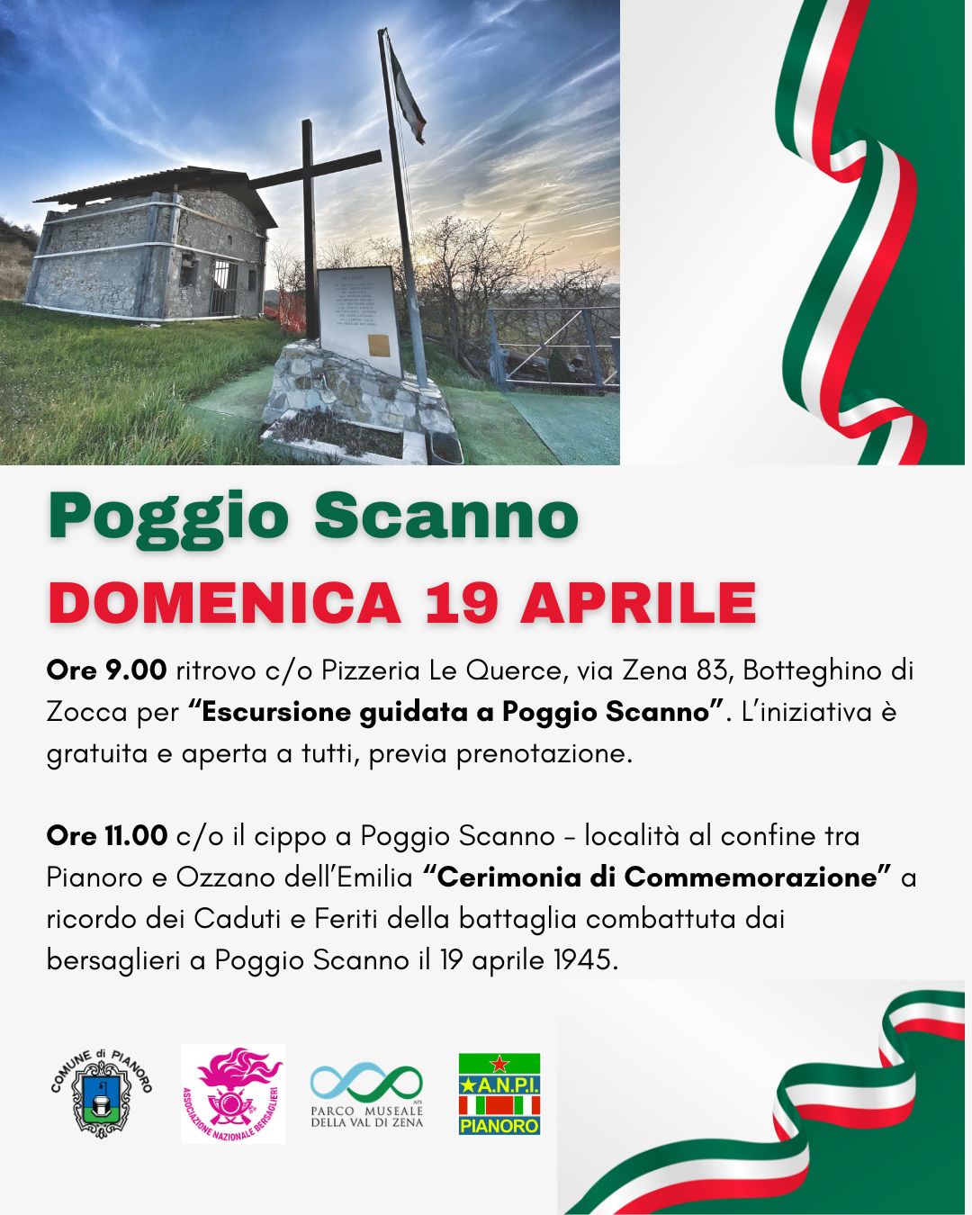 | ore 11 c/o il cippo a Poggio Scanno - località al confine tra Pianoro e Ozzano dell’Emilia “Cerimonia di Commemorazione” a ricordo dei Caduti e Feriti della battaglia combattuta dai bersaglieri a Poggio Scanno il 19 aprile 1945, alla presenza dell’Amministrazione del Comune di Pianoro e di Ozzano dell'Emilia e dai rappresentanti dell'Associazione Bersaglieri.