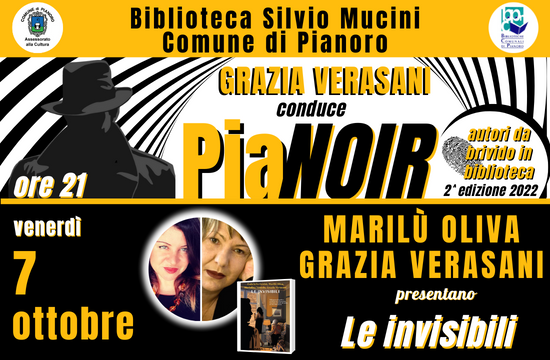 Grazia Verasani e Marilù Oliva presentano "Le invisibili" venerdì 07 ottobre 2022 Grazia Verasani conduce la 2^ edizione diPiaNoir | Autori da brivido in BibliotecaVenerdì 7 ottobreore 21Grazia Verasani e Marilù Oliva presentano Le invisibili (Rizzoli, 2022)Biblioteca S. Mucini PianoroStorie di donne che abitano una normalità banale, celano un disagio inosservato e covano pensieri criminali.Al termine buffet e brindisi con gli autori.Ingresso gratuito. Prenotazione consigliata.Per informazioni e prenotazioni contattare:Biblioteca S. Mucini Pianoro tel: 051774654email: biblioteca.pianoro@comune.pianoro.bo.itDiretta sul canale YouTube del Comune di Pianoro.seguici su: FB ComunePianoroEventiCulturali | IG comunepianoroSul canale YouTube del Comune di Pianoro sono disponibili il video di lancio dell'edizione 2022 e gli incontri di PiaNoir 2021PiaNoir | Autori da brivido in Biblioteca--- categoria Presentazione libri dove Biblioteca Silvio Mucini quando venerdì 07 ottobre 2022 telefono 051774654 e-mail biblioteca.pianoro@comune.pianoro.bo.it
