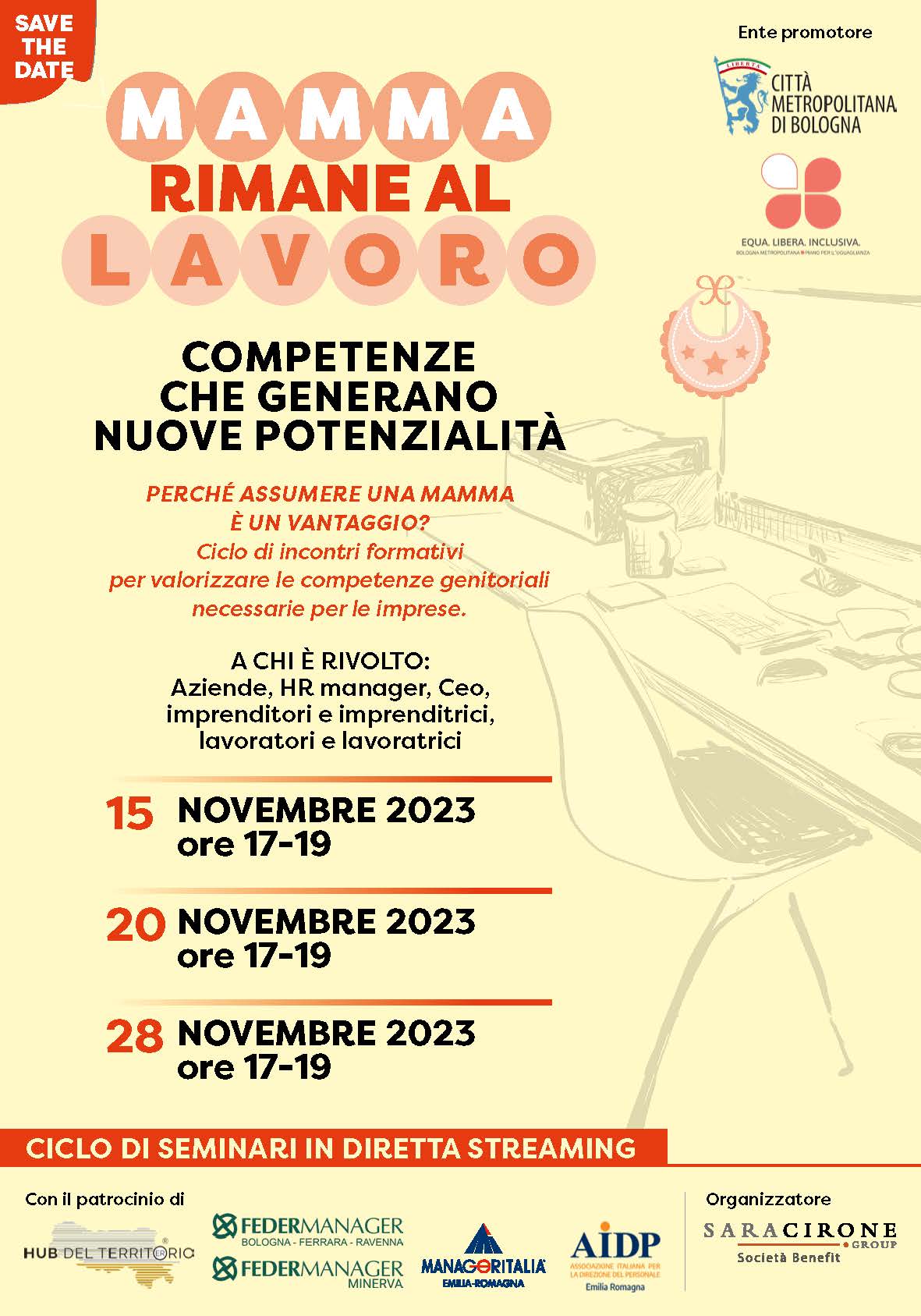 In collaborazione con Manageritalia, Federmanager, AIDP e Fondazione Hub del Territorio ER, organizzati tre incontri con esperte ed esperti, professioniste e professionisti, lavoratori e lavoratrici per mettere in evidenza come le competenze maturate quando si diventa genitori siano competenze solide da spendere anche nel mercato del lavoro e allo stesso tempo necessarie per imprese moderne e innovative.